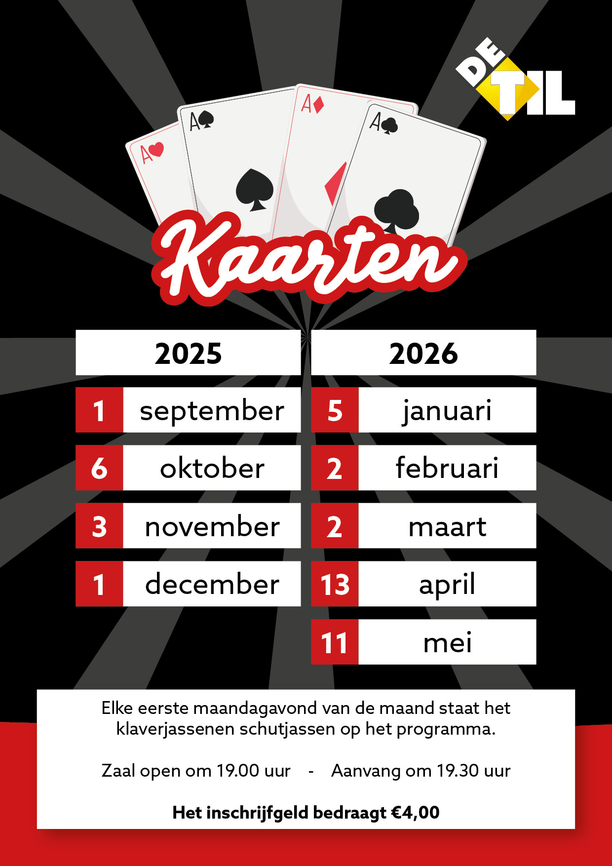Op elke eerste maandagavond van de maand is er het hele jaar door gelegenheid te kaarten in de Til.